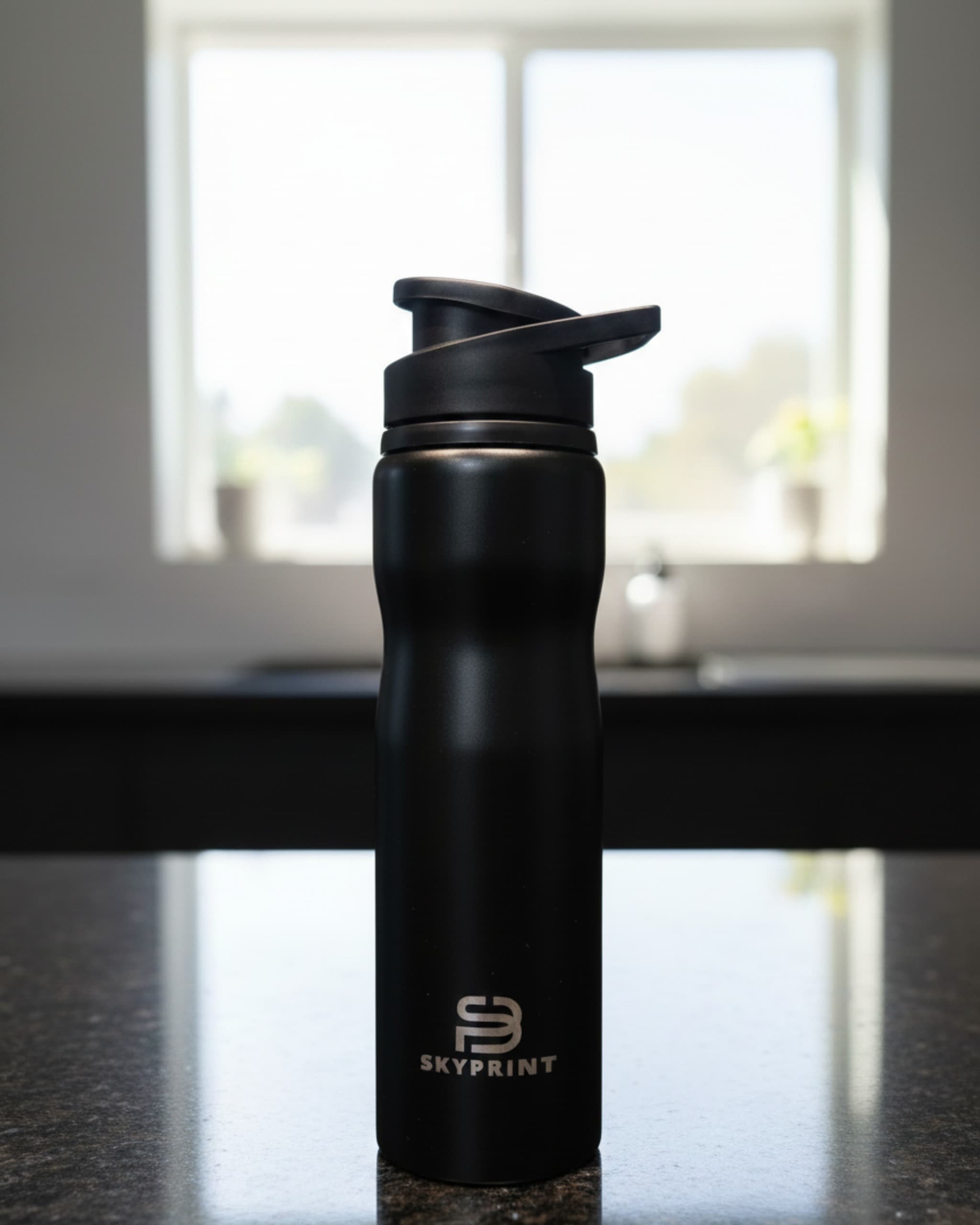 Premium Custom Matte Stainless Steel Sports Bottle Sleek Sophistication for Every Adventure. Premium Matte Finish: Features a high-quality, fingerprint-resistant matte black coating that provides a modern, professional look and a secure, comfortable grip. Durable Stainless Steel: Constructed from robust stainless steel designed to withstand daily use while keeping your beverages at the desired temperature. Ergonomic Contoured Design: The bottle is uniquely shaped with a slight contour for a natural fit in your hand and most standard cup holders. Precision Laser Branding: Showcases a crisp, silver-tone logo at the base, utilizing precision engraving for a permanent, premium brand presentation. Secure Flip-Top Lid: Equipped with a functional, leak-resistant black flip-top lid and a convenient carrying loop for easy transport during commutes or workouts.